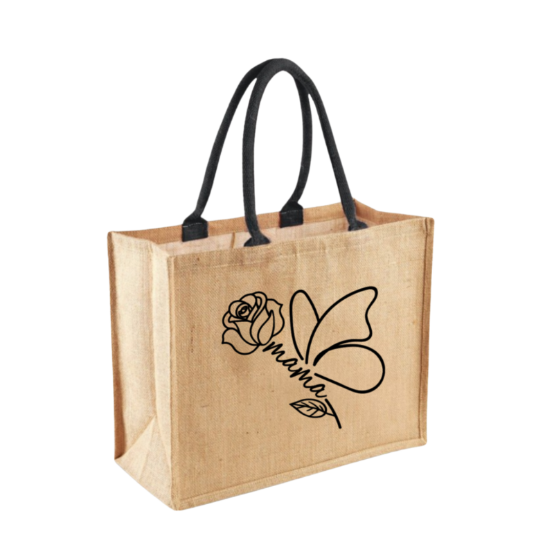 Geanta noastră de iută cu mesajul „Mama", trandafirul elegant și fluturele delicat e din a doua categorie – un cadou care spune tot ce simți, fără să rostești un cuvânt.